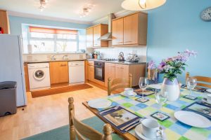 Lounge with TV (with Freesat) and ipod dock, kitchen/dining area (four ringed electric hob and oven, fridge/freezer, microwave, dishwasher and washing machine) bathroom (with WC, wash hand basin, bath and shower).